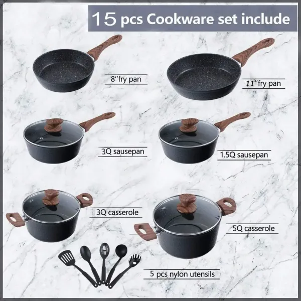 【15 pcs Set Includes】8.15” fry pan,11” fry pan, 1.5 qt saucepan with lid, 3 qt casserole with lid, 3 qt casserole with lid, 5 qt casserole with lid and 5 pieces nylon utensils.
