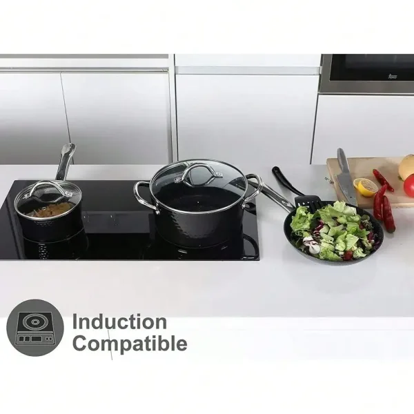 【Induction Cookware Sets】 – When it comes to the interior, this cookware uses an aluminum core. The result is that the pan heats up quickly, and more importantly, distributes heat evenly. The cookware set works on all major types of cooktops, even induction. Sear meat, braise, or even use it as a wok for frying rice