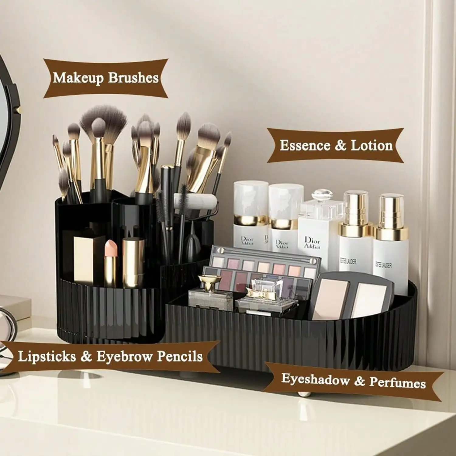 Multiple compartments: The left side makeup tube has a built-in multi compartments organizer divider, which makes it easy to separate your makeup brushes, mascara, eyeliners, small perfumes and lipsticks into different categories. The right side compartment is designed to keep your cosmetics, skin care products, lotions, moisturizers, masks, nail polish, eyeshadow palettes and other small items needed in daily life. Large capacity can easily organize a large number of makeup brushes.